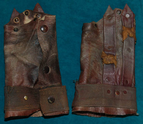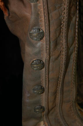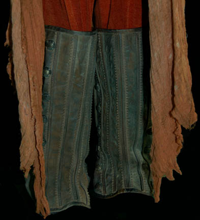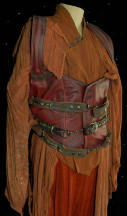 Description: A costume featured in the Star Trek: Enterprise episode “The Forge” for wear by “Syrran” (Michel Nouri), the leader of the separatist ‘Syrranite' movement within Vulcan society, and carrier of the ‘katra’ of Vulcan’s father of logic. The costume is rust colored, pleated trousers with a similar, lightweight shirt with an asymmetrical snap seal with metal buttons above, a lightweight distressed over robe meant to appear torn and frayed along the bottom trim, a red vinyl corset with woven leather belts and metal buckles, multi-leather brown faux reptile skin studded gaiters with zippered backs, and brown leather gauntlets that snap closed. Affixed labels are inscribed ‘Michel Nouri’ and the costumer’s tag reads ‘Enterprise 083, Syrran, Michael Nouri, intact version’.