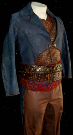 Description: A costume featured in the Star Trek: Enterprise episode “Acquisition” for wear by “Grish” (Matt Malloy), a Ferengi pirate whose ship captured “Enterprise NX-01” in an unsuccessful attempt to steal the ship's stores. The costume is an elaborate brown vinyl jumpsuit with leather riding style accents, a brown woven leather vest, two belts with sewn on metal buttons, a raw woven cummerbund, a pair of purple leather gloves, and a blue leather tail coat. The costumer’s tag reads ‘Enterprise #019 Acquisition, Grish, Matt Malloy’ and lists the components.