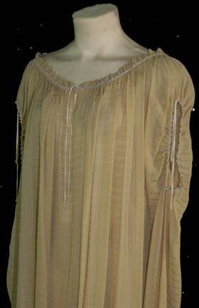Description: “B'Elanna Torres” (Roxann Dawson), half-human and half-Klingon, was Chief Engineer onboard the U.S.S. Voyager during the Star Trek: Voyager series. This pair of negligees was made for wear by Torres during the show. Each shear negligee is sage green with ties at the neck and around the arm holes. Costumes come complete with costume tag.