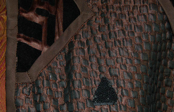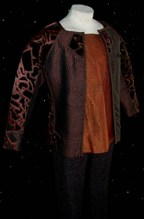 Description: A costume similar in style to those featured in various episodes of Star Trek: Deep Space Nine. This costume is a long-sleeved, tunic in an iridescent, rust-colored, circular design, black, textured, overall-style trousers made to look as if the surface of them is cracking; a brown, metallic-colored jacket with an irregular cube pattern, random shapes of black velveteen framed by a lighter brown satin, and piping the color of the jacket. A sewn in tag reads ‘Deep Space Nine, Andrew Robinson' and the costumer’s tag reads simply ‘DS9, Stunt Garak’.