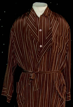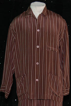 Description: A costume featured in the Star Trek: Deep Space Nine episode “Badda-Bing Badda-Bang”, wherein holographic mobsters mount a hostile takeover of “Vic Fontaine's” (Jimmy Darren) lounge. This costume is for wear by Jimmy Darren in the role of the holographic lounge singer “Vic Fontaine”, and is a long-sleeved, button-down, brown silk pajama shirt with white stripes, functional pockets, matching pajama trousers, and a corresponding brown, silk robe. The costumer’s tag reads ‘DS9 #566, Vic, James Darren’.