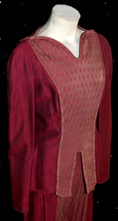 Description: A costume featured in the Star Trek: Deep Space Nine episode “The Passenger”, wherein a criminal attempts to hide his consciousness in the body of one of the station denizens. This costume is for wear by Caitlin Brown in the role of a Kobliad security officer that is tracking the criminal, “Ty Kajada”, and is long-sleeved jacket in a maroon diamond-shaped pattern, a lighter shaded panel along the front and back with its own fashion of diamond shapes, a zip down the back that tucks into the matching overall-style pants, and stirrups for feet. The costumer's tag reads ‘209 The Passenger, Ty Kajada, Caitlin Brown’.