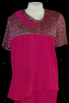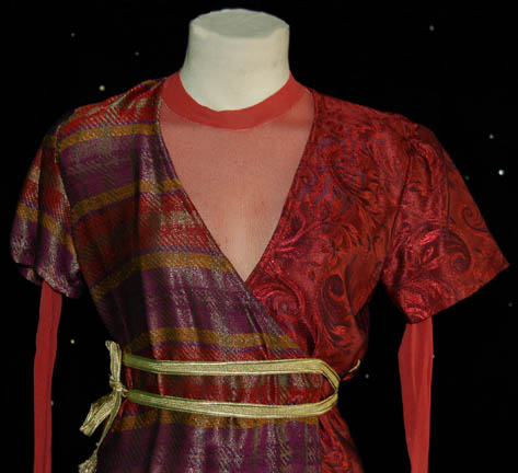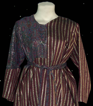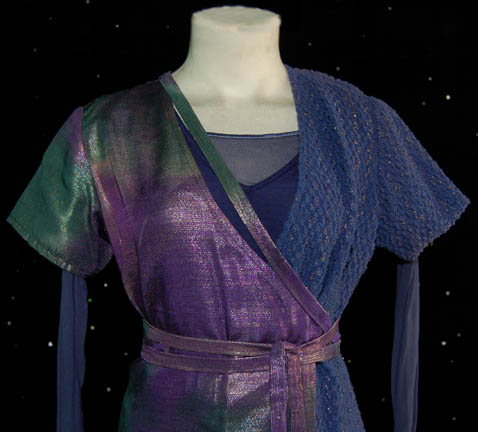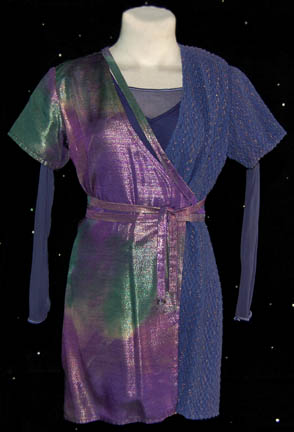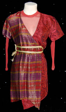 Description: The Sikarians are a humanoid race located in the Delta Quadrant and dedicated to helping others. They were featured in the Star Trek: Voyager episode “Prime Factors” in which “Captain Janeway” (Kate Mulgrew) discovered the race had advanced technology that could fold space and make it possible for them to travel thousands of light-years in seconds. This costume lot includes two female costumes, one male costume and one unisex costume. The first female costume has a shear pink long sleeved leotard with a dress robe worn over the top. The robe is patterned red and black on the left side and striped purple, red and gold on the right side. A gold colored cord wraps around the waist. The second female costume is a navy blue ribbed sleeveless leotard, a shear navy top and dress robe. The robe is woven blue with gold flecks on the left side and shimmering purple, green and gold on the right side. The costume comes with two purple, green and gold waist ties. The male costume is a magenta tunic top with woven multicolored metallic shoulders and a zip up the back. It is accompanied by magenta trousers. The unisex costume is a striped purple and gold tunic top with a patterned right shoulder. The corresponding trousers are purple and gold. The costume comes with a purple and gold colored waist tie. Costumes come complete with costume tags.