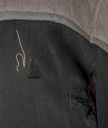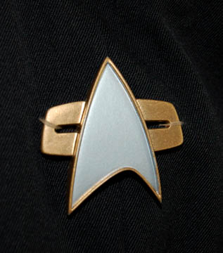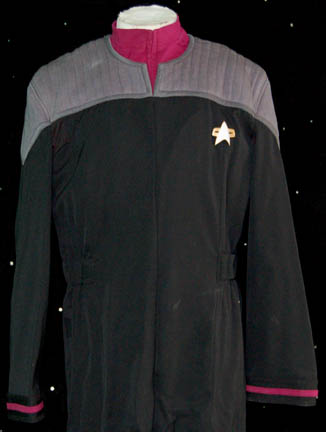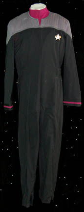 Description: “Worf” (Michael Dorn) was a Klingon from the House of Martok and a Starfleet Lt. Commanding officer during the Star Trek: The Next Generation and Deep Space Nine series as well as the “Generations” movies. This Starfleet uniform lot was made for wear by Dorn's stunt double “Brennan Dyson” during Star Trek: Nemesis. The lot includes two black Starfleet jumpsuits with quilted gray shoulders and Command red trim around the cuffs. One jumpsuit still has the resin Combadge attached to it with Velcro and thread. The other jumpsuit is distressed and has a large rip in the back that’s been patched from the inside with dark blue fabric. There is also a repaired hole under the left arm. A Velcro patch is on the left breast for a Combadge (not included) to attach and there is dirt remaining on the lower sections of the legs. Three Command red cropped sleeve shirts are included, each with zips up the front. The lot is complete with a single pair of black ankle boots, size 13M and made in Italy. Costumes come complete with costume tag.