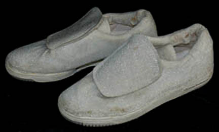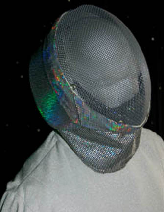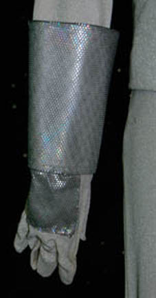 Description: “Lieutenant Dean” (Dan Kern) was a Starfleet officer onboard the Enterprise –D and featured in the Star Trek: The Next Generation episode “We'll Always Have Paris” in which he was “Captain Picard’s” (Patrick Stewart) fencing partner. The uniform includes a sleeveless silver fabric jumpsuit with white top section. The padded fencing jacket is also silver fabric that zips and snaps up the left side. It has a strip of attached fabric that passes between the legs. Due to time and use there are some yellow stains on the cuffs and collar. The impressive fencing mask has a metal face protector with padding on the inside and rainbow metallic fabric on the outside. The corresponding right handed glove is made of the same silver and rainbow metallic fabric. Due to time and use it has marks on the palm of the glove, most likely from holding the sword. The accompanying shoes are New Balance covered in silver fabric. Costume comes complete with costume tag. The sewn in tags indicate this costume was also used by Patrick Stewart’s stunt double “John Nowak”.