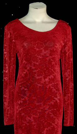 Description: A costume featured in various episodes of Star Trek: Deep Space Nine for wear by Rosalind Chao in the role of the botanist, primary schoolteacher of Deep Space Nine, and wife of “Chief O'Brien” (Colm Meaney), “Keiko O’Brien”. This costume is a long-sleeved, sheer, red dress with a floral print. A sewn in tag reads ‘Deep Space Nine, Rosalind Chao’ and the costumer’s tag reads ‘DS9, Keiko O’Brien, Rosalind Chao’.