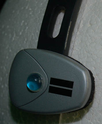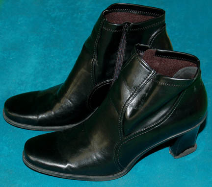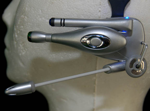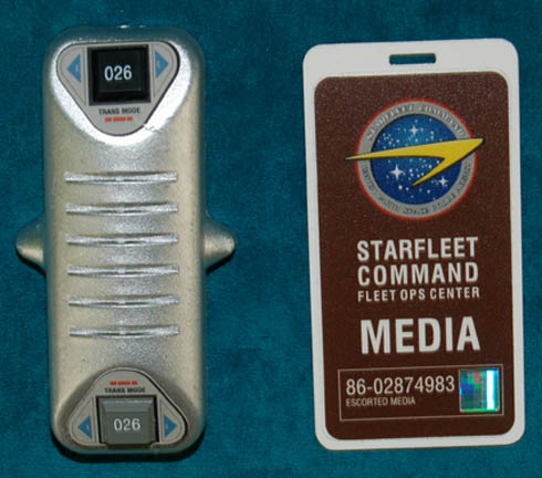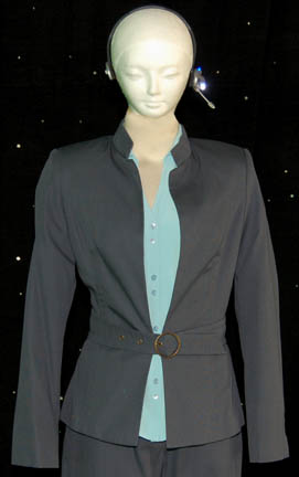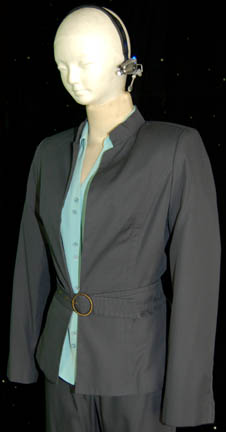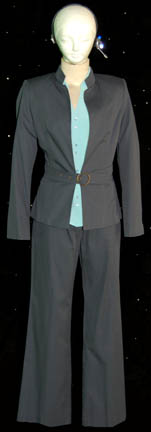 Description: A costume and accessories featured in the Star Trek: Enterprise episodes “Demons” and “Terra Prime” for wear by “Gannet Brooks” (Johanna Watts), a reporter from Earth whose position led the “Enterprise NX-01” crew to believe she was a member of the xenophobic group ‘Terra Prime'. The costume is a name brand set of matching trousers and a matching jacket with a waist belt by ‘Eddie Rodriguez’, a ‘Carlson’ name brand light blue blouse with a paired button front and four button cuffs, and a pair of black leather heel boots with interior zips by ‘Franco Sarto’. Accessories included are five matching earrings by ‘Kenneth Cole, New York’ said to feature ‘natural minerals’; a white badge with a brown colored graphical application adhered to both sides depicting on the front the logo of Starfleet Command and an inscription indicating that it is a ‘Starfleet Command Fleet Ops Center Media’ badge with a holofoil and numeric value, on the reverse is inscribed ‘United Earth Space Probe Agency MEDIA’, the logo of said agency and a logo for ‘exploration’ and visiting instructions including humorous phrases from other famous television and feature films such as “The Blues Brothers”, “Buckaroo Banzai”, and “The Beatles” lyrics; a metallic silver colored plastic ‘universal translator’ with two faux rubber buttons, one colored grey, the other black, both with numeric values and surrounded by graphical applications; and a prop ‘camera microphone headset’ made from a black plastic head bracket with a faux hardware item on the right side painted metallic silver, and a light up ‘recording device’ on the left including two lighted features, one blue and one bright white, activated by a button on the side which can be pressed a second time to make it flash, powered by a pair of CR2025 sized 3volt batteries held internally. The costumer’s tag reads ‘Enterprise #096-097, Gannet Brooks, Johanna Watts’.