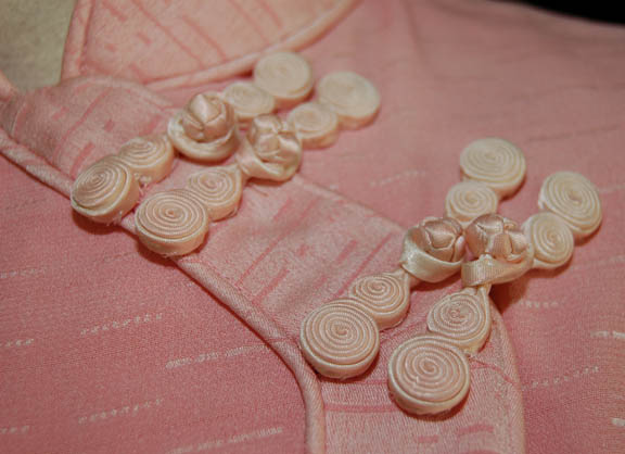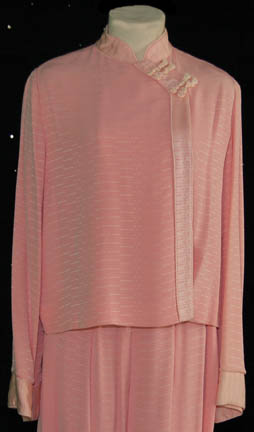 Description: Pajamas made for wear by “Beverly Crusher” (Gates McFadden) during the Star Trek: The Next Generation episode “Cause and Effect”. The crew of the Enterprise-D were caught in a time loop that made them relive events leading to disaster. The pajamas are coral pink in a Mandarin style with decorative fastenings at the neck and snaps up the front. Costume comes complete with two costume tags; one TNG and one Voyager. The sewn in tags indicate this costume was reused during the Star Trek: Voyager series.