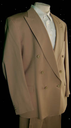 Description: A costume featured in the Star Trek: Deep Space Nine episode “Far Beyond the Stars”, wherein “Captain Sisko experiences a vision from the Prophets where he is “Benny Sisko”, a science fiction writer from the 1950's, who writes a story about the denizens of Deep Space Nine. This costume is for wear by Michael Dorn in the role of the lone black player of the New York Giants in this 1951, “Willie Hawkins”, and is a tan, lightweight, gabardine, double-breasted, suit jacket, matching trousers, and two white, button-down, dress shirts. A sewn in tag reads ‘Deep Space Nine, Michael Dorn’ and the costumer’s tag reads ‘DS9 #538, Worf, Michael Dorn’.