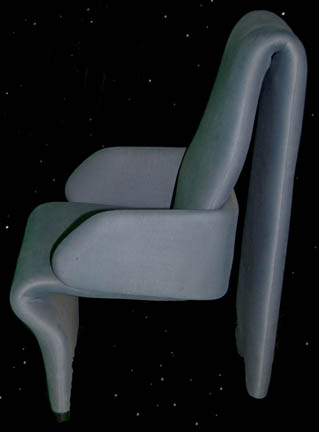 Description: A 24th Century chair in the ‘The Next Generation' style featured in multiple Star Trek episodes including the Star Trek: Enterprise series finale “These are the Voyages…” where it was located in Ten Forward. The blue chair is padded with a curved back and armrests. The legs are black vinyl at the bottom. Measures approx. 21 x 42 x 28 inches.