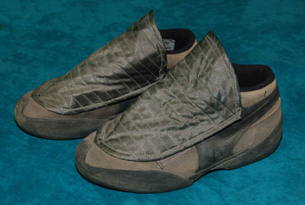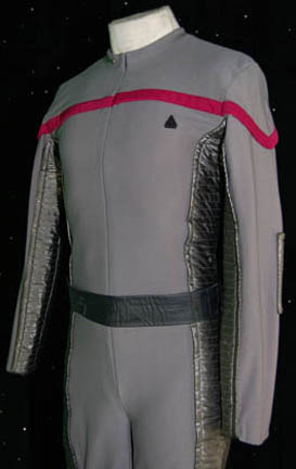 Description: “Lt. Commander Chakotay” (Robert Beltran) was a Starfleet officer onboard the U.S.S. Voyager during the Star Trek: Voyager series. Before joining the crew of the U.S.S. Voyager, Chakotay was a member of the “Maquis” that he joined to defend his home colony. This is his Away Mission uniform that includes a gray jumpsuit with silver quilted sides, knees and inner arms. A Command red band runs around the upper torso and there is a zip up the front. A small Velcro patch is on the left side of the chest for a Combadge (not included) to attach. Two snaps are on the right side of the collar for a metal Maquis pip to attach. A black vinyl belt is included along with modified Nike shoes. The sewn in tag reads “Voyager – Robert Beltran”. Costume comes complete with costume tag.