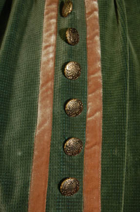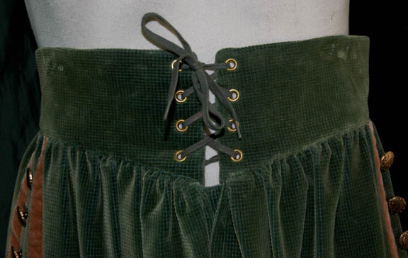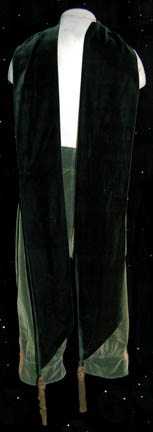 Description: “Geordi La Forge's” (LeVar Burton) 19th century period costume made for wear in the Star Trek: The Next Generation episode “Hollow Pursuits” in which a troubled “Lieutenant Barclay” (Dwight Schultz) created a fantasy in the holodeck. The costume lot includes two pairs of green breeches each with lacing at the waist. Down the side of each leg is two strips of brown trim with detailed gold colored buttons in between. Due to time and use the buttons are missing from the lower legs of both pairs. Also included are two pairs of gold colored tights and a green sash with tassels at the ends. Green flares for the boots (not available) are included. Costumes come complete with costume tags.
