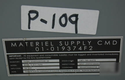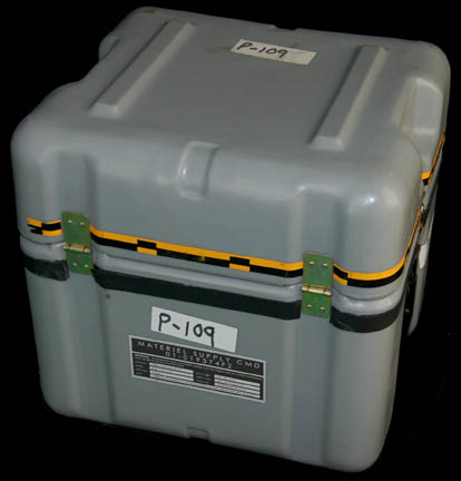 Description: A freestanding desk and chair built in the style present on “Enterprise NX-01” appearing in various episodes of Star Trek: Enterprise like “Cold Front” and “Future Tense”. The desk is made from two layers of sturdy L-shaped wood with beveled edges and covered in metallic silver, the legs are silver colored aluminum with Speed Rail joints and feet with holes prepared for mounting to a base or deck. The underside of the desk features an inscription reading ‘ND Crew Quarters STE' and a label inscribed ‘Crew, Danial Quarters’. The item comes with an Enterprise style chair with a rolling five armed base on a size adjusting pedestal with a rocking back and height adjusting arms, the item is composed of high quality molded plastic with a gray vinyl seat cushion and back, and a gray Starfleet style footlocker with butterfly clasp seals and a hinged lid, the case features multiple ‘Starfleet Material Supply Command’ inventory applications, and two black spring handles and measures approx. 16 X 17 X 17 inches. The arms of the chair feature screw threaded fasteners, the one on the left is missing. The desk measures approx. 30 X 42 X 72 inches and the chair measures approx. 37 X 24 X 21 inches.