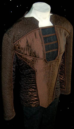 Description: A costume featured in the Star Trek: Voyager episode “Nothing Human”, wherein a non-humanoid creature attaches itself to “B'Elanna Torres” (Roxann Dawson) and “The Doctor” (Robert Picardo) uses a holographic representation of the Federation’s leading exobiologist to assist him. This costume is for wear by David Clennon in the role of the Cardassian exobiologist “Crell Moset”, and is a black, body pad, a long-sleeved, brown jacket featuring intricate, lightly-textured, diamond-shaped patterns along the sleeves, brown iridescent fabric in further diamond-shapes along the ribs and under the sleeves, intricate floral designs along the chest, and even further, textured, black, floral designs. Included are trousers in the design of the textured, black floral pattern on the jacket, and brown trousers with black sewn in over it; both trousers are overall-style and have stirrups for the feet. Pictures alone cannot properly display the craftsmanship and intricacy that went into the creation of this garment; it must be seen to be believed. A sewn in tag reads ‘Deep Space Nine, John Austen’ and the costumer’s tag reads ‘Voyager #200 Nothing Human, Moset, David Clennon’.