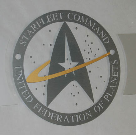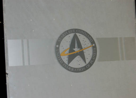 Description: This incredible window was made for use as set dressing in “Admiral Janeway's” (Kate Mulgrew) Starfleet Command office in the Star Trek: Voyager series finale “Endgame”. The window is made of clear acrylic with a silk screened silver and gold Starfleet Command – Federation of Planets emblem in the center. White paper is attached on the back but it is only adhered around the edges so could be removed if desired. Due to time and storage the paper has slightly browned and has a tear at the bottom. Measures approx 84 x 35 x ¼ inches.