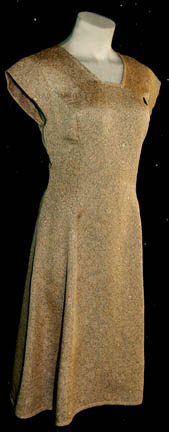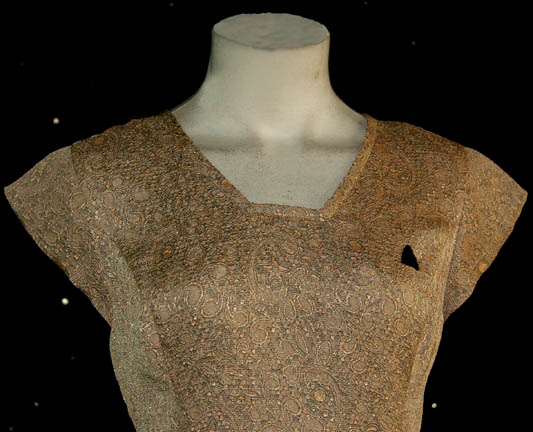 Description: “Kes” (Jennifer Lien) was from the Ocampa species who was rescued by “Neelix” (Ethan Phillips) and bought onboard the U.S.S. Voyager. She started off growing fruits and vegetables in a hydroponics garden in one of the cargo bays then later studied to become a nurse in sickbay. This costume was made for wear by Kes in the Star Trek: Voyager episode “Projections” in which the “Doctor” (Robert Picardo) was informed that he was Lewis Zimmerman; the creator of the ‘Emergency Medical Hologram (EMH) program. The dress is patterned mustard yellow with an A-frame lower section, a small Velcro patch on the left breast for a Combadge (not included) to attach and a zip up the back. Costume comes complete with costume tag. The sewn in tags indicate this costume was reused by two other Voyager actresses.