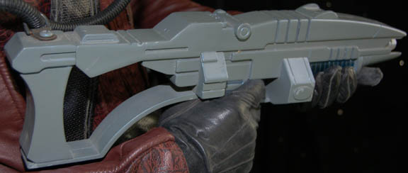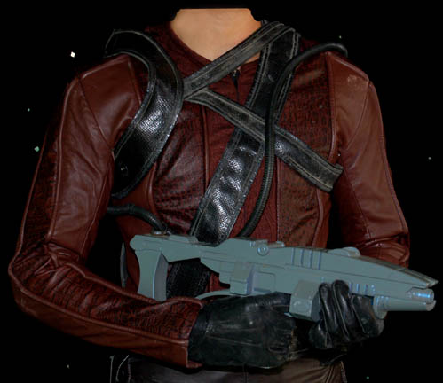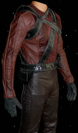 Description: A costume featured in various episodes of Star Trek: Enterprise like “The Andorian Incident” and “Cease Fire” for wear by “Tholos” (Stephen Dennis). The costume is brown vinyl trousers with a crisscross pattern on the outside seam, and a matching brown leather jacket with faux reptile skin trim, black leather gloves, a shoulder harness, and a belt with a black leather flap pocket pouch. The costume also comes with a solid cast resin Andorian energy carbine with an attached shoulder strap wrapped in black plastic tubing. The prop gun is painted an iridescent blue and reflects light measureing approx. 17 X 6 X 2 inches. Sewn in Enterprise tags read ‘David Venafro', and the costumer’s tags reads ‘Enterprise #041 Cease Fire’, ‘Andorian Incident Enterprise 007, Tholos, Stephen Dennis’.