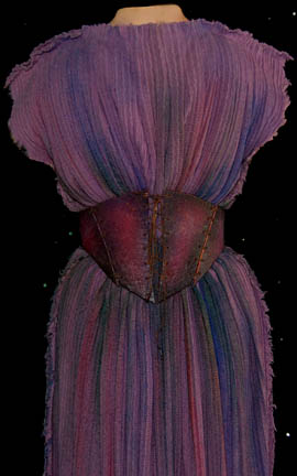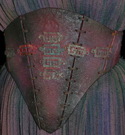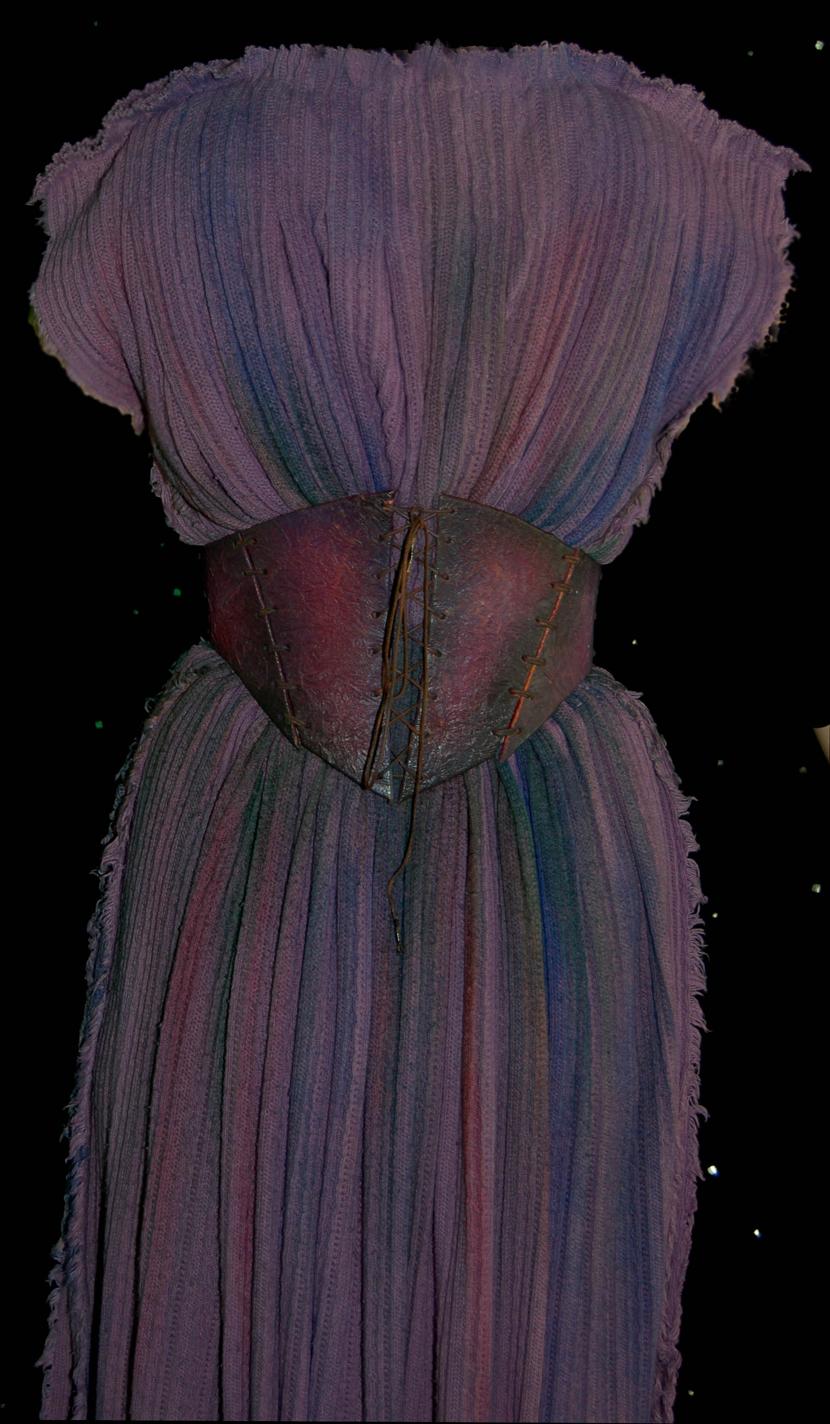 Description: “Tanis” (Kathleen Garrett) was an actress in “Kelis” (Joseph Will) troupe of actors and featured in the Star Trek: Voyager episode “Muse” in which she played “Captain Janeway” (Kate Mulgrew) in Kelis' play. The knitted dress is multiple shades of purple with a fringe trim and elastic waist. It has fastenings at the shoulders and stylized slits up each side. Worn over the dress is a purple suede corset with added embellishments and leather lacing. Due to time and use one of the embellishment’s in missing. Costume comes complete with costume tag. According to Memory Alpha, this episode was nominated for an Emmy Award for Outstanding Costumes for a Series.