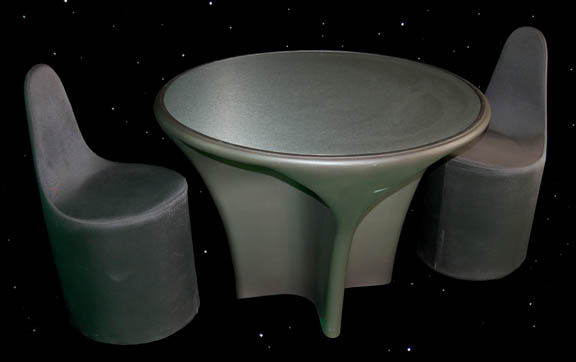 Description: This great table and two chairs set was featured during many episodes of Star Trek: Enterprise series and were part of the décor of the Enterprise NX-01 galley. As such, crew members were filmed on multiple occasions eating and socializing around them. The gray table has a futuristic molded appearance built up around a wooden frame. Each chair is covered with gray fabric with a smooth rise from the seat to the chair back and rolls on wheels. Table measures approx. 30 ½ x 39 inches diameter and each chair measures approx. 33 x 15 ½ x 17 inches.