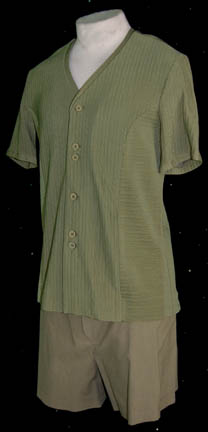 Description: A costume featured in the Star Trek: Enterprise episode “Bounty”, wherein “Captain Archer” (Scott Bakula) is kidnapped by a Tellarite who intends to collect the bounty that the Klingons put on him. This costume is for wear by John Billingsley in the role of the Chief Medical Officer aboard the “Enterprise NX-01”, “Dr. Phlox”, and is a short sleeved shirt in a pea-green shade with textured, horizontal and vertical stripes, buttons down the front, v-neck collar, matching green shorts, very slight fading on the left side, and a sewn in tag that reads ‘Enterprise, John Billingsley'. Items were found separately but all in the “John Billingsley” collection.