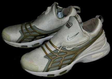 Description: A costume featured in the Star Trek: Enterprise episode “Vanishing Point”, wherein a series of strange occurrences, following her first experience with the transporter, starts to convince “Ensign Sato” that she is becoming invisible. This costume is for wear by Linda Park in the role of the Communications Officer of the “Enterprise NX-01”,”Ensign Hoshi Sato”, and is a burgundy-colored, sleeveless exercise top with spaghetti straps, grayish-brown sweatpants, stirrups for the feet, and white tennis shoes with olive green, plastic accents, and a Velcro cover for the laces. A sewn in tag on both reads ‘Enterprise, Linda Park, #036'. Items were found separately but matched with episode numbers and screen caps.