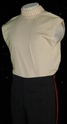 Description: A set of Starfleet officer's Class-A uniform items featured in various Star Trek feature films from Star Trek II: The Wrath of Khan through Star Trek VII: Generations selected to begin a uniform collection, or add to an existing one for completion. The costume is a set of black officer’s trousers with a red command division stripe down the outside seam of the legs, two lengths of unattached black elastic believed to be suspenders, and a white command division colored sleeveless undershirt with a ribbed collar. The trousers feature a sewn in Star Trek VII tag reading ‘S. Williams’.
