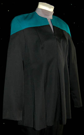 Description: A costume featured in the Star Trek: Voyager episode “Tattoo”; wherein “Commander Chakotay” finds a ceremonial symbol on in the remains of a camp fire on a planet in the Delta Quadrant that he recognizes from trip he took with his father when he was younger. This is costume is for wear by Nancy Hower in the role of the pregnant xenobiologist “Ensign Samantha Wildman”, and is a standard type-B Starfleet uniform altered for maternity; long-sleeved, full-length, jumpsuit that has the usual gray undershirt attached to black jumpsuit pants with stirrups for the feet, a long-sleeved, pleated, black Starfleet tunic, Sciences Blue division strip, a Velcro patch on the left breast for a commbadge (not included), Velcro cuff adjustment ,a zip down the front, is open at the bottom. A sewn in tag reads ‘Voyager, Nancy Hower'