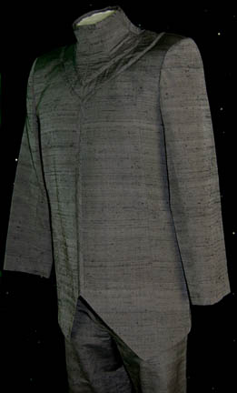 Description: A costume featured in the Star Trek: Voyager episode “Natural Law”, wherein “Commander Chakotay” (Robert Beltran) and “Seven of Nine” (Jeri Ryan) are trapped in a primitive area of an otherwise advanced planet and cannot contact “Voyager” or any of the other more technological inhabitants of the planet. This costume is for wear by one of the Ledosian scientists, and is a long-sleeved, gray jacket with horizontal black stripes, a matching, sewn in, dickie, and corresponding trousers but in a slightly reflective finish. A sewn in tag reads ‘Voyager, Michael Moutsatsos' and the costumer’s tag reads ‘#268 Natural Law, Ledosian Scientist, Michael Moutsatsos’.