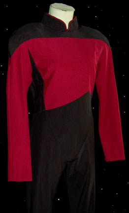 Description: “Ensign Ro Laren” (Michelle Forbes) was a Bajoran national who served in Starfleet on board the Enterprise-D during the Star Trek: The Next Generation series before joining the Maquis. The jumpsuit is black with Command red sleeves and upper torso. There is red trim around the collar, a small Velcro patch on the left breast for a Combadge (not included) to attach and a zip up the front. Costume comes with costume tag.