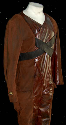 Description: A costume featured in the Star Trek: Voyager episode “Dragon's Teeth”; wherein “Voyager” takes cover on a devastated planet and finds a group of aliens, called the Vaduwar, who have survived for 900 years in cryo-stasis. This costume is for wear by Ron Fassler in the role of the tactical officer for the leader of the Vaduwar that survived their cryo-stasis, “Morin”, and is a long-sleeved, full-length jumpsuit in brown suede and a faux-scale, maroon vinyl pattern, wrap-around flaps that button, clasp, and zip down the front, black straps that cross the chest and attach by Velcro along the back, a gold-colored an iridescent metal accent on the right cuff, a pocket on each leg, black fabric attached to the bottom of the leg with stirrups for the feet on the end of it. A sewn in tag reads ‘Voyager, Ron Fassler’ with a tag pinned on top of it and a costumer’s tag that reads ‘225 Voyager Dragon’s Teeth, Morin, Ron Fassler’