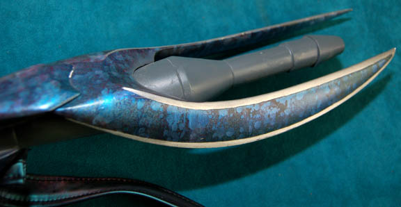 Description: A prop energy weapon featured in Star Trek X: Nemesis for use by Reman soldiers. The item is a Reman rifle, a cast resin rifle with a metallic purple paint job, a vinyl shoulder strap, a metal double bayonet beveled and painted to appear sharp, with a trigger button that activates a triple LED emitter tip, and a switch which activates a top mounted red ‘targeting scope'. The switch for the scope has loosened from its position but still works. The item is powered by an unknown power source and still retains energy from production use. Item measures approx. 35.5 X 7.25 X 1.75 inches.