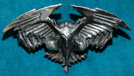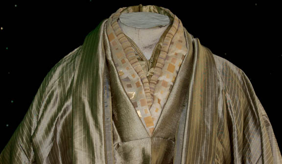 Description: A costume featured in Star Trek X: Nemesis for wear by Romulan senators. The costume is a full length robe long sleeved robe with an added collar featuring metallic gold colored square pattern, an outer robe with kimono style bat wing sleeves, and a mandarin style collar dickie. The costume also comes with a cast resin pewter colored, pin backed badge depicting the Nemesis-style Romulan Star Empire logo, a bird of prey swooping towards the viewer with the twin worlds of Romulus and Remus clutched in its talons.