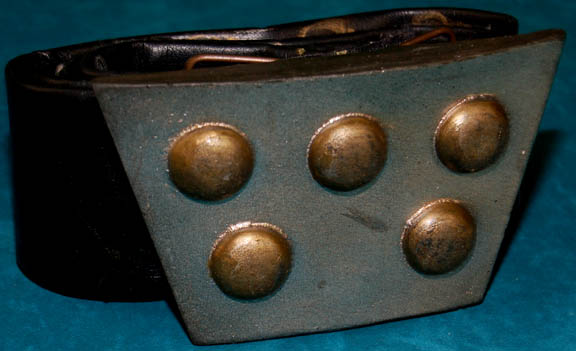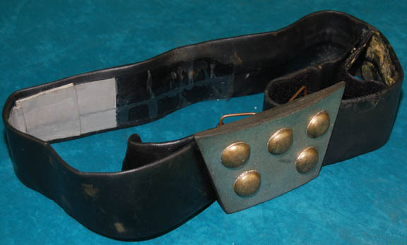 Description: A costume accessory appearing in Star Trek feature films and episodic television, a Klingon belt and buckle. The item is black vinyl with a resin buckle painted metallic silver with five metallic gold colored ‘studs' and a pair of wire loops molded into the reverse. The belt measures approx. 45 inches, some of which is meant to wrap around the wire, and several Velcro placements are present.