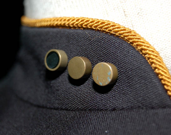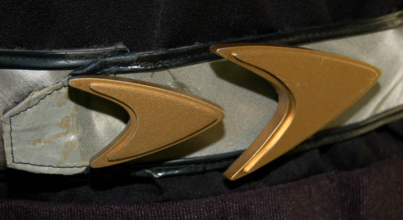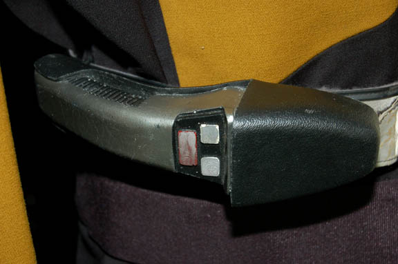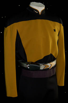 Description: “Lt. Commander Geordi La Forge” (LeVar Burton) was Chief Engineer onboard the Enterprise-D and later the Enterprise-E during the Star Trek: The Next Generation series and the ‘Generations' movies. This is his Starfleet uniform made for wear during seasons 3 – 7 of the show. It includes an Operations gold jacket with black shoulders, sides and bottom. The jacket has La Forge’s Lt. Commander rank pips attached on the right collar. The backing, black pip and center pip are original to the costume however the right rank pip was missing. One has been added to complete the costume but was not necessarily La Forge’s. There is a zip up the back and a small Velcro patch on the left breast for a Combadge (not included) to attach. The corresponding trousers are black. Costume comes complete with costume tag. Around the waist is a silver vinyl belt with black trim and two gold painted resin Starfleet buckles featured in the Star Trek: The Next Generation episode “Yesterday’s Enterprise”. The larger buckle is not original to the belt but is added to complete it. The Velcro is missing from the belt to hold the larger buckle in place. There are two snaps on the left side for a phaser holster (not available) to attach. Written with mark pen on the inside of the belt it reads “Le Var”. Also included is a foam phaser and holster not original to the costume, molded as one piece with two metal hooks on the back for it to attach to a belt. The prop is painted black to define the holster and silver to define the phaser. Measures approx. 8 x 2 ¼ x 2 inches.