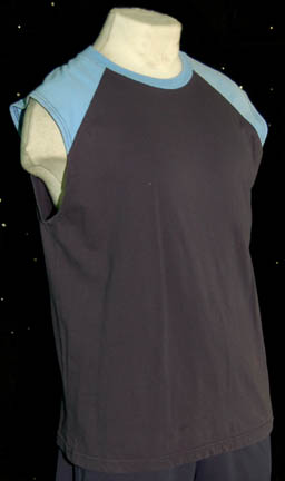 Description: A costume featured in the Star Trek: Enterprise episode “The Forge”, wherein Earth's embassy on Vulcan is bombed, it is traced back to a religious faction known as the “Syrrannites”. This costume is for wear by Connor Trinneer in the role of the Chief Engineer of the “Enterprise NX-01”, “Commander Charles Tucker”, during a basketball betwixt members of the crew, and is a short-sleeved, dark-blue, cotton shirt, light-blue around the sleeves and collar, matching, dark-blue, polyester, Nike shorts, with functional pockets, and the name “Connor” written on the tag. Items were found separately but all in the “Connor Trinneer” collection.