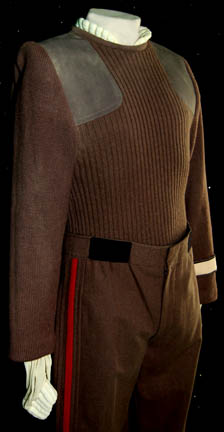 Description: A stunt costume featured in Star Trek V: The Final Frontier for wear by “Captain Kirk” stunt double Don Pulford. The costume is brown wool trousers with a red division stripe down the outside seam of the legs, a white long sleeved undershirt with a ribbed collar and cuffs unique to this style of costume, the collar features a broken styled collar in the front center, and a brown sweater top with black Velcro placements on the waist, and a white command division strip affixed to the left sleeve forearm. The sweater and trousers feature sewn in Paramount tags reading ‘Pulford' and the interior tag in the shirt is illegible. The costumer’s tags read ‘Star Trek V, Don Pulford, Stunt DBL, Capt. Kirk, Chg# 4, 4A’, a second one is additionally inscribed ‘fibreglass flying rig’. One reads, Pulford, side pick’.