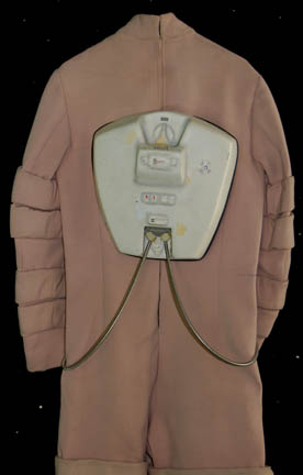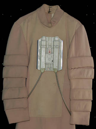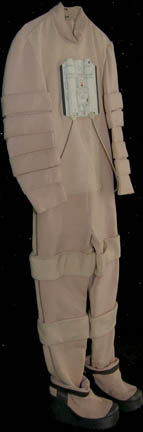 Description: A costume appearing in various Star Trek feature films for Starfleet personnel in the technical or special services fields. The costume is an off white jumpsuit with wide ring accents around the sleeves and legs, with loops for the attachment of equipment made from molded plastic components which are mounted onto the center back and chest, connected by metal wrapped wiring. The costume comes with matching boots with thick soles. Characters wearing this style of costume can be seen in the recreation deck scene in Star Trek I: The Motion Picture, working in the hall outside the training bridge at Starfleet Academy and running through the corridors of the “USS Enterprise-A” prior to battle with the “USS Reliant” in Star Trek II: The Wrath of Khan, and cleaning the observation area in spacedock when the “USS Enterprise-A” is stolen by its command crew in Star Trek III: The Search for Spock.