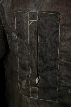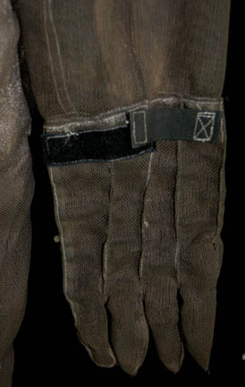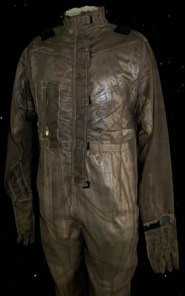 Description: A costume featured in the Star Trek; Voyager episode “Alice”; wherein “Lieutenant Paris” (Robert Duncan McNeill) rescues a supposedly haunted shuttle that has a neurogenic interface that begins to affect his mind. This costume is for wear by Star Trek veteran John Fleck in the role of the previous owner of the shuttle “Alice” who is driven into a panic just by the thought of it, “Abaddon”, and is a long-sleeved, metallic silver-colored shirt and trousers, lightly distressed for effect, a full-length, long-sleeved, jumpsuit of transparent, loose, brown netting with a functional, zip pocket on the right breast, Velcro and zip closures down the front, zip cuff adjustments, gloves attached by Velcro, and stirrups for the feet. The jumpsuit is also distressed for effect, having a frayed collar and ankle cuffs. John Fleck has played six roles over the course of the four modern Star Trek series, the most notable being the Suliban “Silik” from “Enterprise”. A sewn in tag reads ‘Voyager, John Fleck' and a costumer’s tag that reads ‘Voyager, 226 Alice, Abaddon, John Fleck’
