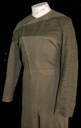 Description: A costume featured in the Star Trek: Voyager episode “Living Witness”; wherein “The Doctor” (Robert Picardo) is brought back online after 700 years to answer for “war crimes” that it is believed that he had a hand in on “Voyager”. This costume is for wear by regular Star Trek stuntman J. R. Quinonez and is a long-sleeved, full-length, olive-colored jumpsuit with a wrap-around panel that affixes via clasps, buttons, and zippers, and horizontal stripes in different shades of brown and black along the chest and left sleeve. A sewn in tag reads ‘Voyager, J.R. Quinonez'.