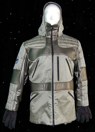 Description: A costume featured in the Star Trek: Enterprise episode “Regeneration”, wherein a group of scientists find the remains of a Borg vessel, are promptly assimilated by the drones that they revive, and the “Enterprise NX-01” is called in to track down the drones after they take the scientists' ship and heavily modify it. The costume is for wear by John Short in the role of one of the hapless archeologists that have no idea what they have come upon when they find the remains of a Borg vessel and two drones, “Dr. Drake”, and is heavy coat of a reflective silver color with a high collar, a close fitting hood, an “Earth Sciences Institute”, an “Arctic Archeology” patch, both on the right shoulder, a heavy duty zipper down the front, and a soft off-white long sleeved shirt with a zipper partially down the front, a little embroidered dinosaur skeleton near the waist hem, and a pair of black leather thermal gloves that tighten around the wrist. A sewn in tag reads ‘Enterprise, John Short’ and the costumer’s tag reads ‘Enterprise #049 Regeneration, Drake, John Short’.