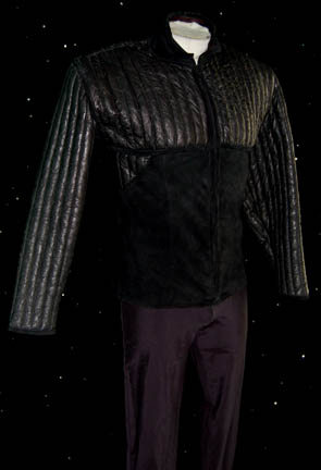 Description: A costume featured in the Star Trek: Voyager episode “Resistance”; wherein “Captain Janeway” (Kate Mulgrew) is forced to rely on an unstable resistance fighter to rescue some imprisoned crew members. This costume is for wear by Tim Russ in the role of the Vulcan Security Officer, “Lieutenant Commander Tuvok”, and is a sleeveless black jumpsuit, a zip up the front, stirrups for the feet; a black, two-tone, jacket of quilted, vertical stripes, and black suede, more black suede around the cuffs and collar, and a zip up the front. A sewn in tag reads ‘Voyager, Tim Russ' and the costumer’s tag reads ‘Voyager 128 Resistance, Mokra’.