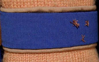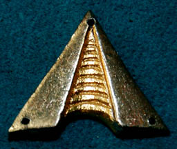 Description: A security officer's field duty uniform featured in Star Trek V: The Final Frontier during scenes taking place on Nimbus III. The costume is caramel colored wool trousers with a purple stripe running down the outside seam of the legs, a matching sweater top with a purple division strip on the left forearm, and a purple long sleeved undershirt with a ribbed collar and cuffs. The costume comes with an unattached silver and gold colored metal rank badge indicating the wearer to be an ‘ensign’, the division strip reveals evidence of a previously affixed badge in the way of loose threads.