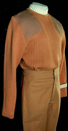 Description: A stunt costume featured in Star Trek V: The Final Frontier for wear by “Spock” stunt double Greg Barnett, with a sleeveless undershirt with a white ribbed collar featuring a sewn in Paramount tag reading ‘Spock Nimoy'. The costume is comprised mainly of caramel colored trousers with red colored division strips affixed to the outside seams of the legs, a matching sweater with a command white division strip affixed to the left forearm sleeve, and a white sleeveless undershirt with a ribbed collar. The sewn in Paramount tag on the sweater reads ‘Nimoy’, the one in the trousers reads ‘St. Dbl Spock, Greg Barnet’, and the one in the shirt reads ‘double Nimoy’. To reiterate, the costume does feature two separate undershirts. The costumer’s tag reads ‘Star Trek V, Leonard Nimoy as Spock, CHG# 3, 3A, 3B Fiberglass Flying Harness’.