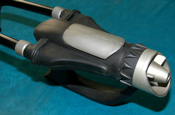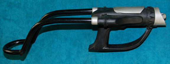 Description: A prop firearm featured in Star Trek IX: Insurrection for use by Son'a characters. The item is a prop molded foam rubber hand gun with a plastic arm brace affixed to it, colored black with metallic silver paint accents, the item measures approx. 30 X 7.5 X 6.5 inches.