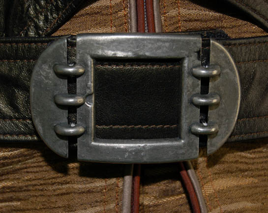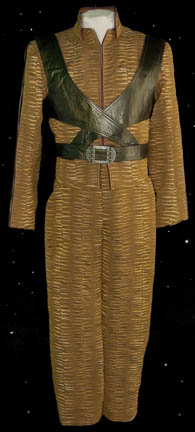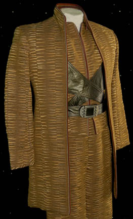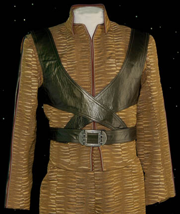 Description: A costume featured in the Star Trek: Enterprise episode “Proving Ground”, wherein “Commander Shran” (Jeffrey Combs) appears in an Andorian starship to assist in the “Enterprise NX-01” in finding the Xindi super weapon. This costume is a textured, vertical tiger-striped, brown and gold jacket with brown piping, beige and reflective, green-vinyl trim, brown satin lining, a green vinyl harness that wraps around the shoulders and waist culminating in a metal buckle. The overall-style trousers and robe are also tiger striped brown and gold. A sewn in tag denotes wear by multiple actors and the costumer's tag reads ‘Enterprise #065 Proving Grounds, Xindi-Humanoid’ Xindi-Primates were referred to as “Xindi-Humanoids” during the early part of the third season.