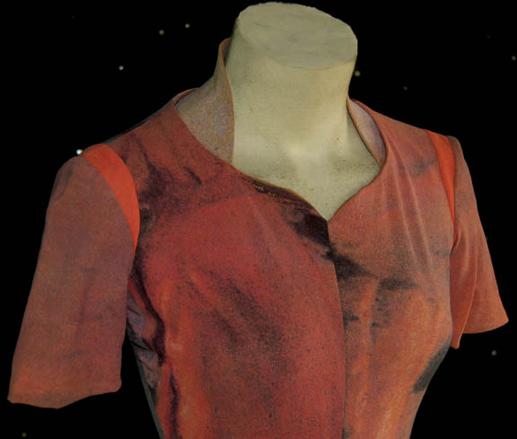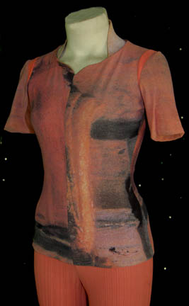 Description: A costume featured in the Star Trek: Enterprise episode “Home”, wherein the “Enterprise NX-01” returns from defeating the Xindi threat and saving Earth from destruction to find much hero worship but also much xenophobia on the rise. This costume is for wear by Jolene Blalock in the role of Vulcan science officer on the “Enterprise NX-01”, “Subcommander T'Pol”, and is a light, short-sleeved shirt with a pink/black design, a zip up the front, matching pink trousers, textured, vertical stripes, and a red accent around the waist. A sewn in tag reads ‘Enterprise, Jolene Blalock #079’.
