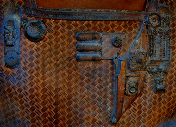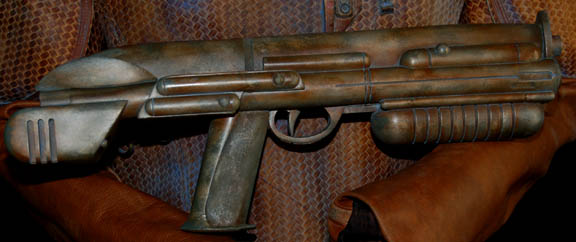 Description: A costume featured in the Star Trek: Enterprise episode “The Xindi”, wherein we catch our first glance of a Xindi in a trillium mining planet on the edge of the Delphic Expanse. The costume is that of one of the guards in the mining facility and is a brown, leather, overall-style trousers with stirrups for the feet, a brown leather long sleeved shirt, a heavy-duty woven tunic over the shirt with linked leather and metal belts and plastic accents that are distressed to look worn and exposed to mining conditions. Also included is the weapon used in that episode; a rubber cast, copper-colored phase carbine distressed in the same way.