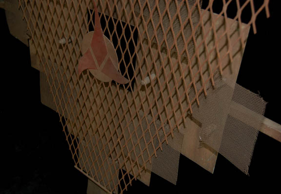 Description: The Klingons are a humanoid warrior civilization originally from the planet Qo'noS but now a strong and revered interstellar military power seen throughout the Star Trek anthology. This is a piece of Klingon set dressing made for use on the Star Trek series. It is made of metal bars and mesh held together with screws and features a Klingon emblem in the center. The three points of the emblem are painted dark red for detail. The small square base has four screw holes in it for anchoring. Measures approx. 42 x 35 ½ x 2 inches.