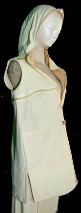 Description: A costume featured in Star Trek I: The Motion Picture for wear by patients in sickbay on the “USS Enterprise”. The costume is extremely soft trousers and a matching cream colored sleeveless top with a quilted midsection and an attached hood with faded coloring dulled down to brown. The costume also features silver colored foil accents holding in place multiple clear tubes running the length of the wearer.
