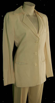 Description: A costume featured in the Star Trek: Voyager episodes “Future's End: Part I & II”; wherein “Voyager” encounters a Federation “timeship” from the future and get flung back to the 20th century. This costume is for wear by Kate Mulgrew as the captain of the starship “Voyager”, “Kathryn Janeway”, is an off-white suit jacket with functional pockets, buttons down the front, and matching trousers. The trousers have a small blue ink stain near the waist. A sewn in tag reads ‘Voyager, Kate Mulgrew’.
